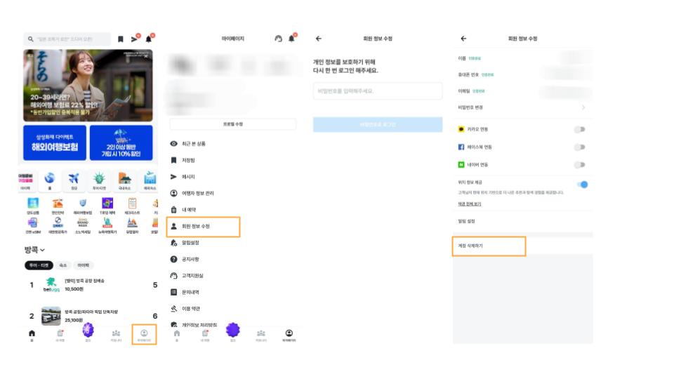 [계정문의] 계정 탈퇴는 어떻게 하나요? 2026년 03월 05일 05:33 업데이트 시간 계정 탈퇴는 프로필 설정 페이지에서 [계정 삭제하기]를 통해 가능합니다. APP 앱 하단 오른쪽 [마이페이지] > [회원 정보 수정] > [계정 삭제하기] WEB[홈페이지 메인] > [상단 오른쪽 프로필] > [프로필 관리] > [계정 삭제하기] 이 밖에 추가 문의 사항이 있다면 고객지원실로 문의해주세요. 관련 문서 [계정문의] 로그인 이메일 주소(계정)을 변경하고 싶어요. [계정문의] 비밀번호/로그인 계정을 잊어버렸는데 초기화할 수 있나요? [계정문의] 네이버 계정이 내가 알고 있는 계정과 달라요 [계정문의] 회원가입은 어떻게 하나요? [최저가보장제]최저가 보장제는 뭔가요? 어떻게 신청하나요?