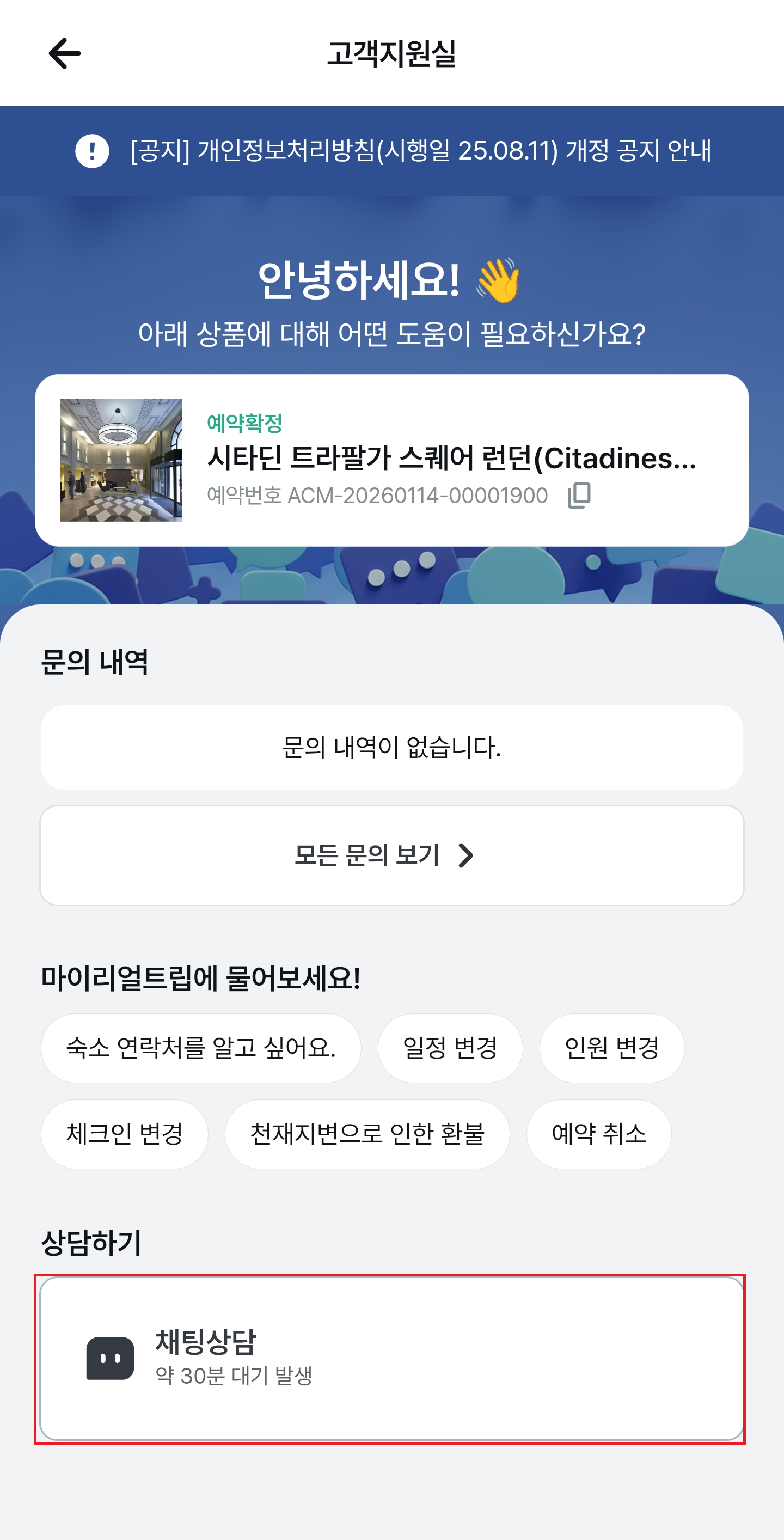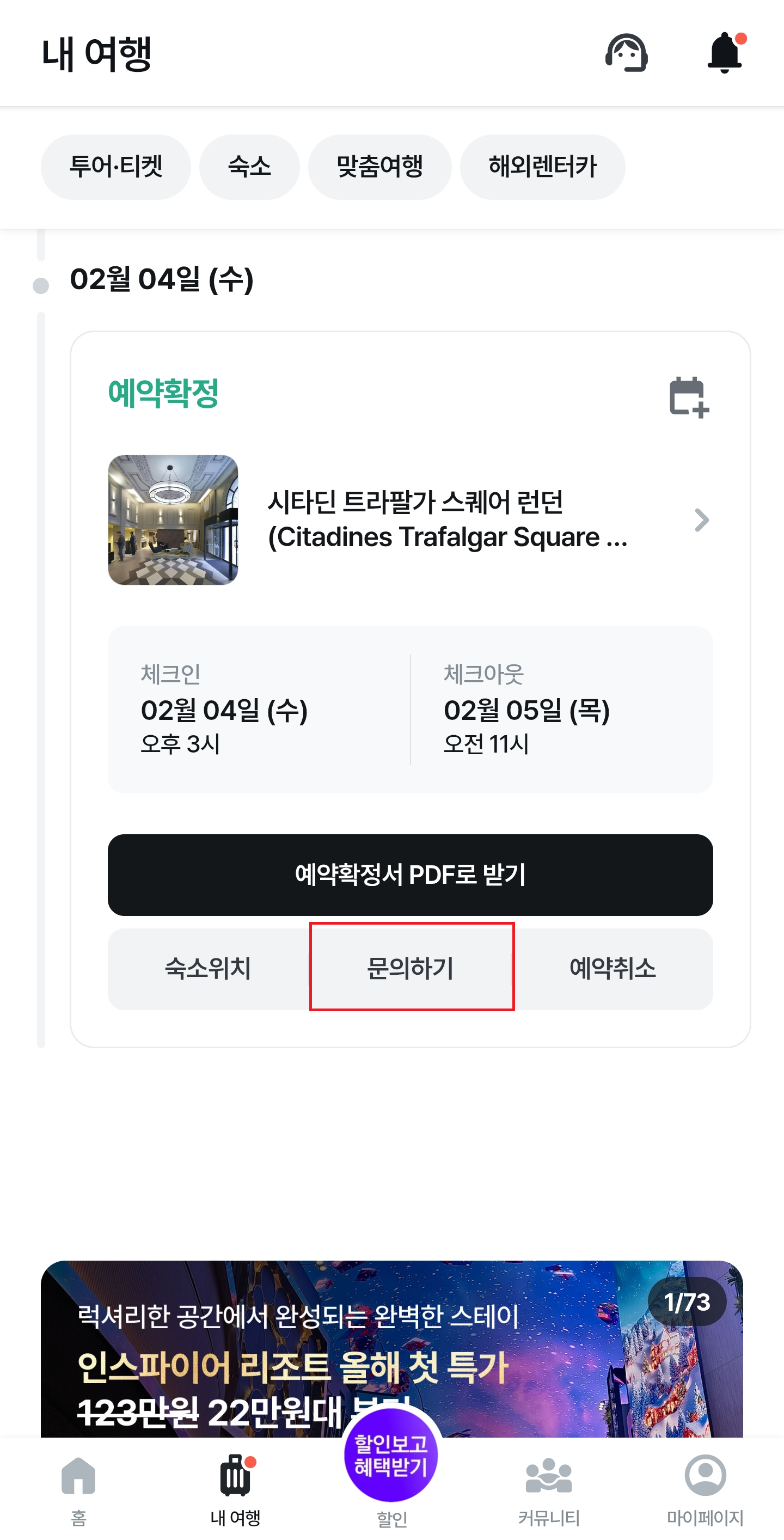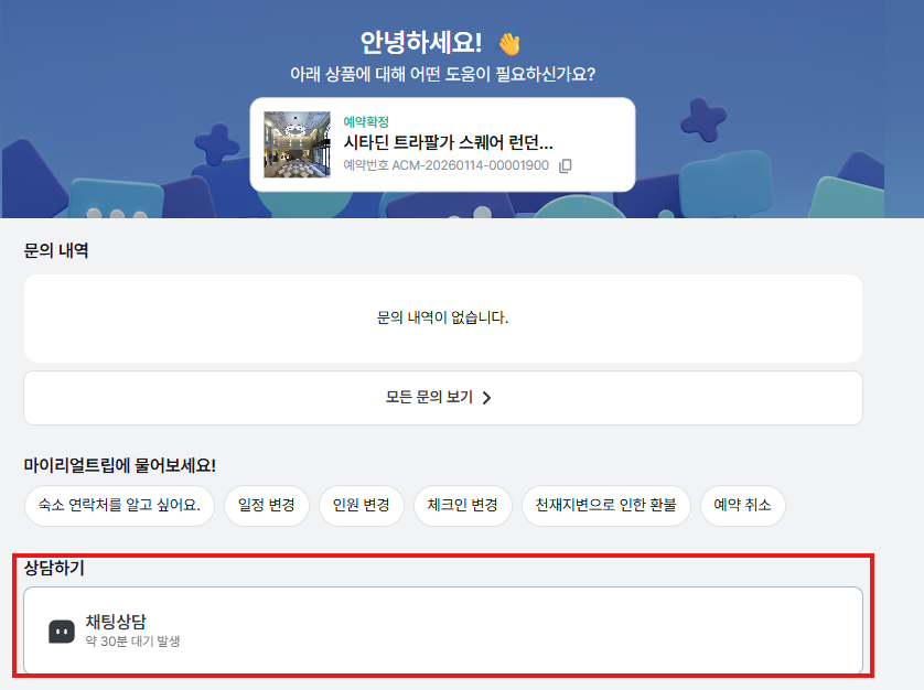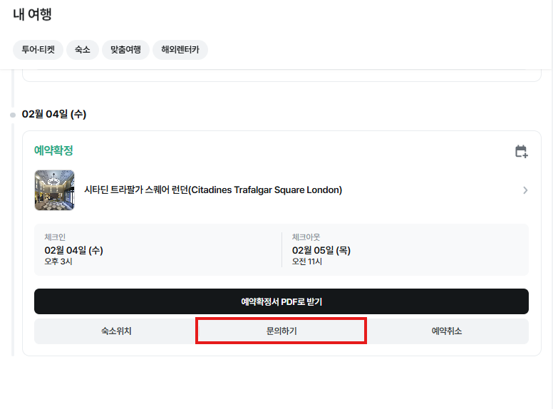상품별 취소 환불 규정을 꼭 먼저 확인하시고, 취소가 가능하신 상황임에도 취소가 진행되지 않으실 경우에는 하기 이미지를 참고하시어 [내 예약] 내 [문의하기] 버튼을 이용하시어 문의 부탁 드립니다.