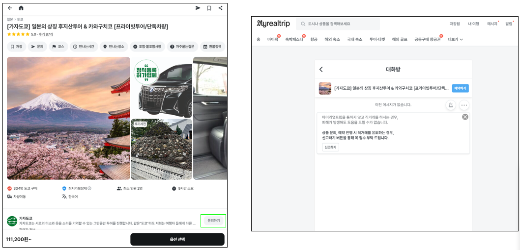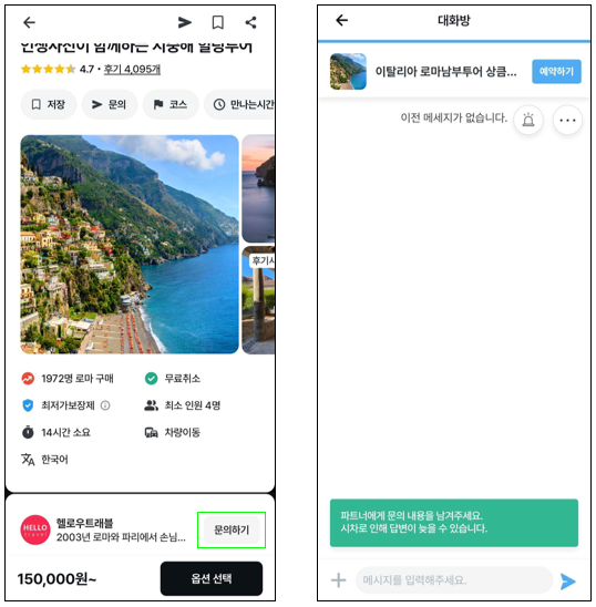 상품 페이지 내의 가이드(파트너) 이름 옆 "문의하기" 버튼 클릭