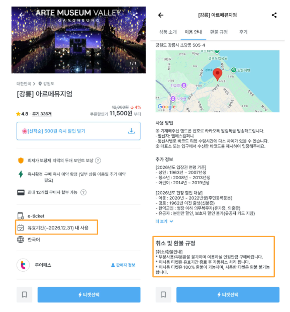 상품 상세 페이지에서 취소 및 환불 규정, 유효기간 안내 규정에 따라 티켓 환불 및 변경 가능 여부를 확인하실 수 있습니다.