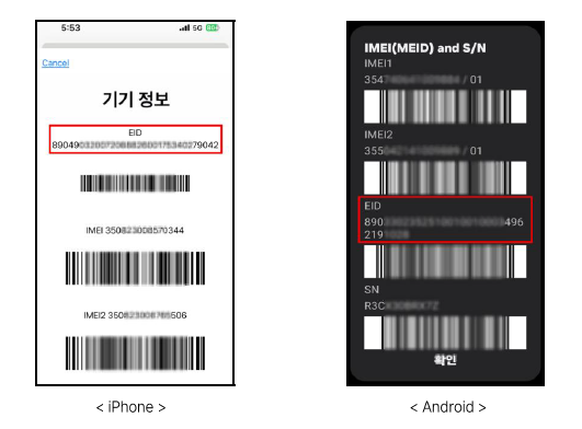 확인 방법 : 통화 → 키패드 → *#06# 입력 → EID 확인