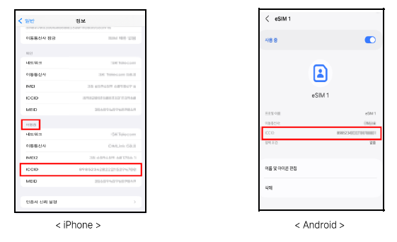 Android : 설정 → 연결 → SIM관리자 → eSIM1 클릭 → ICCID
