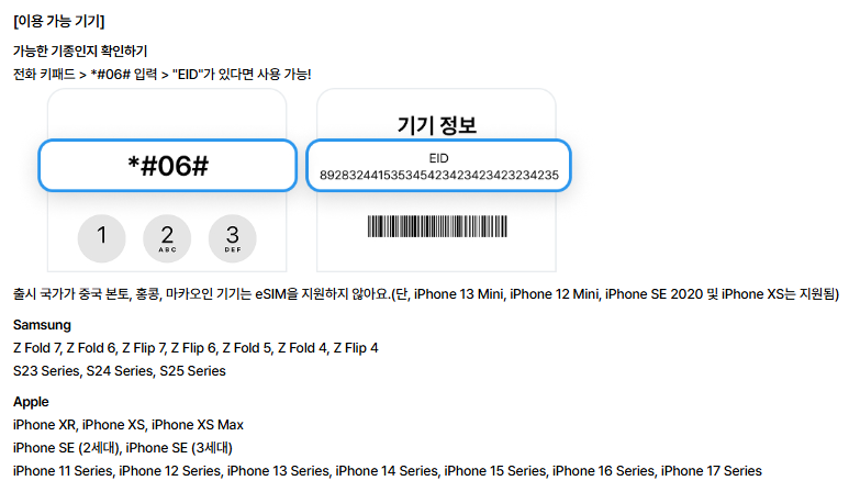 이때 뜨는 기기 정보 화면에 EID 정보가 포함되어 있다면, 이심 사용 가능한 기종이니 안심하고 구입하세요.